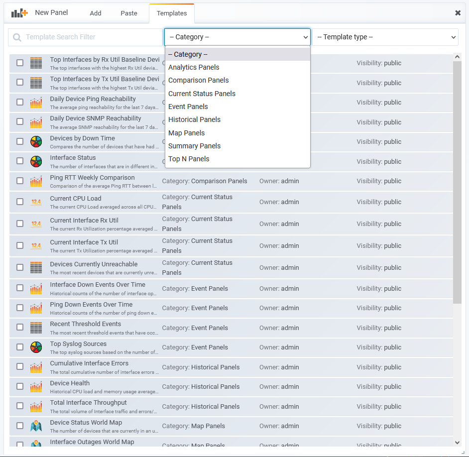 Panel templates are preconfigured panels which can be added to your custom dashboards. Statseeker v5.6.0 offers over 30 ready-to-use panel templates including: